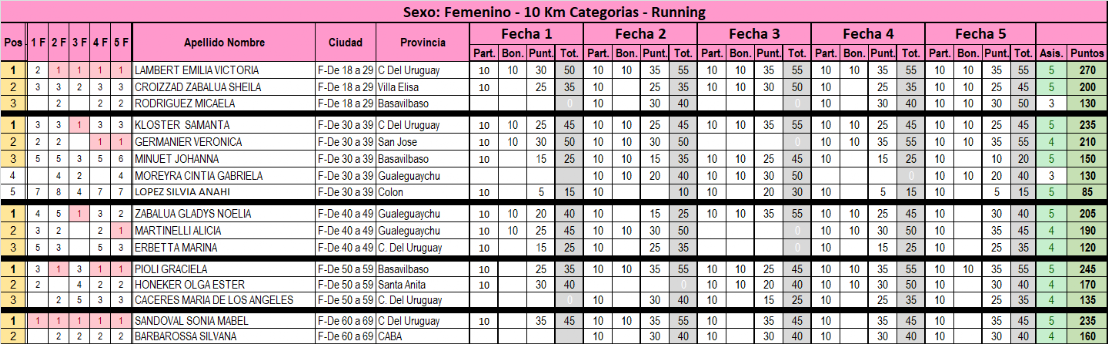 TABLA DE PUNTOS A LA 4TA FECHA - RUNNING 10 KM - CATEGORÍAS