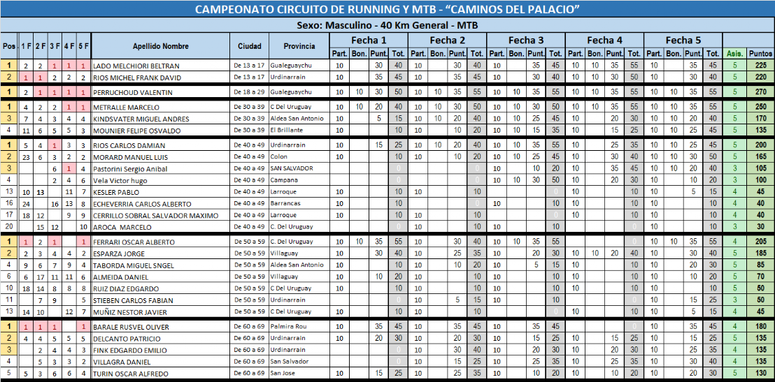TABLA DE PUNTOS A LA 4TA FECHA - MTB 40 KM - POR CATEGORÍAS