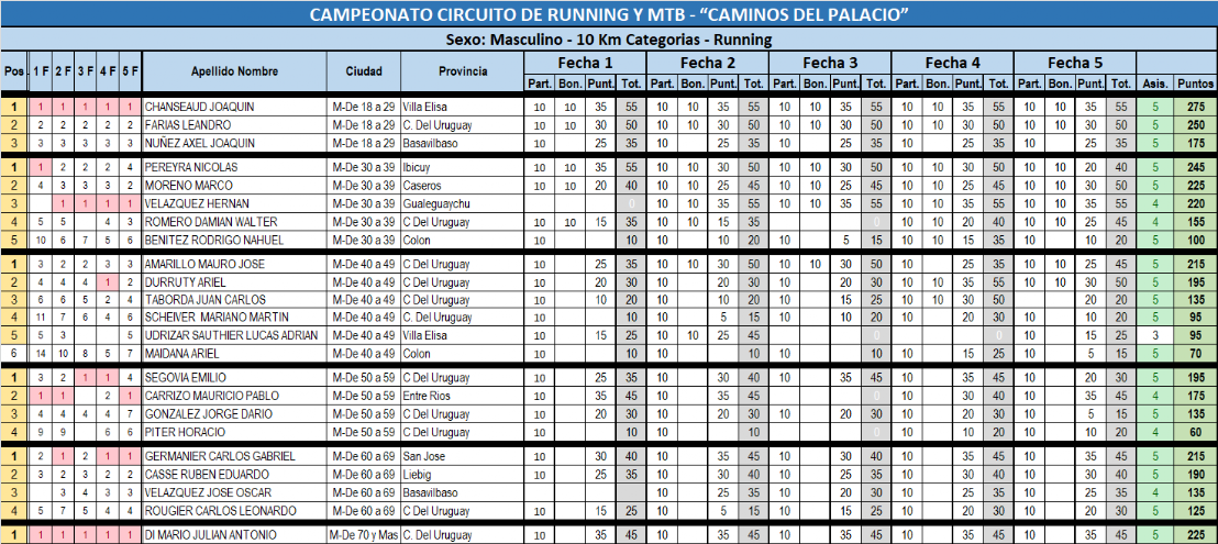 TABLA DE PUNTOS A LA 4TA FECHA - RUNNING 10 KM - CATEGORÍAS